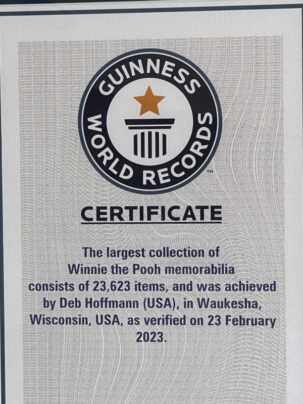 I am Deb Hoffmann and since 2008 I am honored to have held the Guinness World Record (GWR) for the largest, "Pooh and Friends Memorabilia Collection" in the world. Needless to
